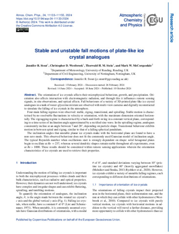 Stout, J. R. orcid id iconORCID: https://orcid.org/0000-0003-2858-4872, Westbrook, C. D. orcid id iconORCID: https://orcid.org/0000-0002-2889-8815, Stein, T. H. M. orcid id iconORCID: https://orcid.org/0000-0002-9215-5397 and McCorquodale, M. W. (2024) Stable and unstable fall motions of plate-like ice crystal analogues. Atmospheric Chemistry and Physics, 24 (19). pp. 11133-11155. ISSN 1680-7324 doi: 10.5194/acp-24-11133-2024