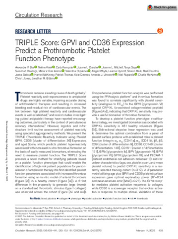Bye, A. P. orcid id iconORCID: https://orcid.org/0000-0002-2061-2253, Kriek, N., Kempster, C., Dunster, J. L. orcid id iconORCID: https://orcid.org/0000-0001-8986-4902, Mitchell, J. L., Sage, T., Rawlings, S., Diaz Alonso, M. V., Shpakova, V. orcid id iconORCID: https://orcid.org/0000-0002-9304-7099, Whyte, A., Dymott, L., Mark, S., Brunton, M., Batista, J., McKinney, H., Thomas, P., Downes, K., Unsworth, A. J., Ruparelia, N., McKenna, C., Jones, C. I. orcid id iconORCID: https://orcid.org/0000-0001-7537-1509 and Gibbins, J. M. orcid id iconORCID: https://orcid.org/0000-0002-0372-5352 (2025) TRIPLE score: GPVI and CD36 expression predict a prothrombotic platelet function phenotype. Circulation Research, 136 (4). pp. 439-441. ISSN 0009-7330 doi: 10.1161/CIRCRESAHA.124.325701