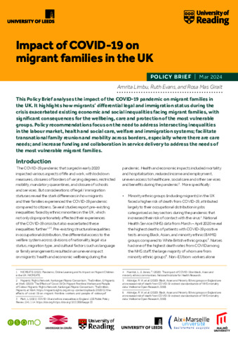 This Policy Brief analyses the impact of the COVID-19 pandemic on migrant families in the UK. It highlights how migrants’ differential legal and immigration status during the crisis exacerbated existing economic and social inequalities facing migrant families, with significant consequences for the wellbeing, care and protection of the most vulnerable groups. Policy recommendations focus on the need to address intersecting inequalities in the labour market, health and social care, welfare and immigration systems; facilitate transnational family reunion and mobility across borders, especially where there are care needs; and increase funding and collaboration in service delivery to address the needs of the most vulnerable migrant families.