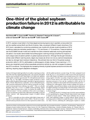 One-third of the global soybean production failure in 2012 is attributable to climate change.