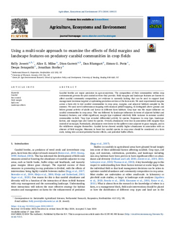 Jowett, K. orcid id iconORCID: https://orcid.org/0000-0002-3672-7813, Milne, A. E., Garrett, D., Blumgart, D., Potts, S. G. orcid id iconORCID: https://orcid.org/0000-0002-2045-980X, Senapathi, D. orcid id iconORCID: https://orcid.org/0000-0002-8883-1583 and Storkey, J. orcid id iconORCID: https://orcid.org/0000-0003-1094-8914 (2024) Using a multi-scale approach to examine the effects of field margins and landscape features on predatory carabid communities in crop fields. Agriculture, Ecosystems & Environment, 373. 109115. ISSN 1873-2305 doi: 10.1016/j.agee.2024.109115