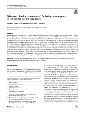 Godley, A. C. orcid id iconORCID: https://orcid.org/0000-0002-3160-2499, Hamilton, S. and Joseph, M. orcid id iconORCID: https://orcid.org/0000-0002-3045-9897 (2025) When does historical context matter? Explaining the emergence of competence‑creating subsidiaries. Journal of International Business Studies. ISSN 1478-6990 doi: 10.1057/s41267-024-00768-6