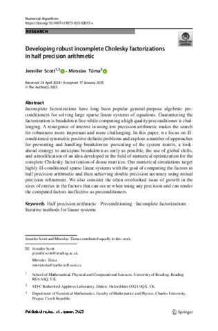 Scott, J. orcid id iconORCID: https://orcid.org/0000-0003-2130-1091 and Tůma, M. (2025) Developing robust incomplete Cholesky factorizations in half precision arithmetic. Numerical Algorithms. ISSN 1572-9265 doi: 10.1007/s11075-025-02015-x