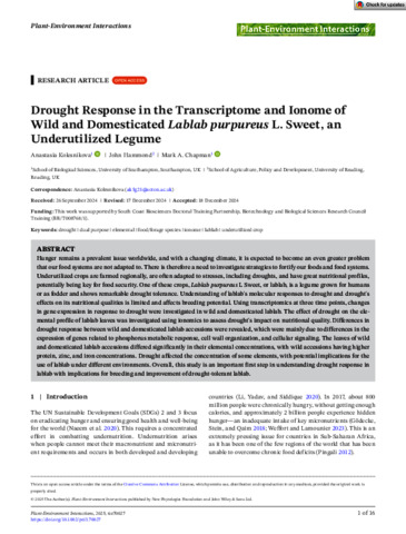 Kolesnikova, A. orcid id iconORCID: https://orcid.org/0000-0003-1227-1580, Hammond, J. orcid id iconORCID: https://orcid.org/0000-0002-6241-3551 and Chapman, M. A. orcid id iconORCID: https://orcid.org/0000-0002-7151-723X (2025) drought response in the transcriptome and ionome of wild and domesticated Lablab purpureus L. Sweet, an underutilized legume. Plant-Environment Interactions, 6 (1). e70027. ISSN 2575-6265 doi: 10.1002/pei3.70027