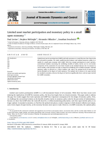 Levine, P., McKnight, S., Mihailov, A. orcid id iconORCID: https://orcid.org/0000-0003-4307-4029 and Swarbrick, J. (2025) Limited asset market participation and monetary policy in a small open economy. Journal of Economic Dynamics and Control, 173. 105047. ISSN 1879-1743 doi: 10.1016/j.jedc.2025.105047