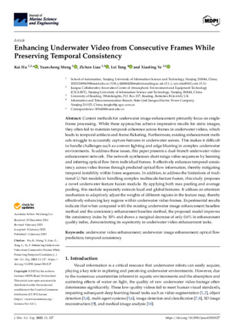 Hu, K. orcid id iconORCID: https://orcid.org/0000-0001-7181-9935, Meng, Y. orcid id iconORCID: https://orcid.org/0000-0001-6901-8282, Liao, Z. orcid id iconORCID: https://orcid.org/0009-0006-4686-3436, Tang, L. orcid id iconORCID: https://orcid.org/0009-0003-2401-8520 and Ye, X. orcid id iconORCID: https://orcid.org/0000-0002-1628-2060 (2025) Enhancing underwater video from consecutive frames while preserving temporal consistency. Journal of Marine Science and Engineering, 13 (1). 127. ISSN 2077-1312 doi: 10.3390/jmse13010127