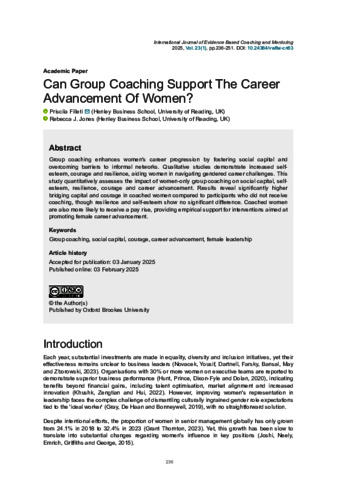Filleti, P. and Jones, R. orcid id iconORCID: https://orcid.org/0000-0001-7329-0502 (2025) Can group coaching support the career advancement of women? International Journal of Evidenced Based Coaching and Mentoring, 23 (1). pp. 236-251. ISSN 1741-8305 doi: 10.24384/vw8w-cn63
