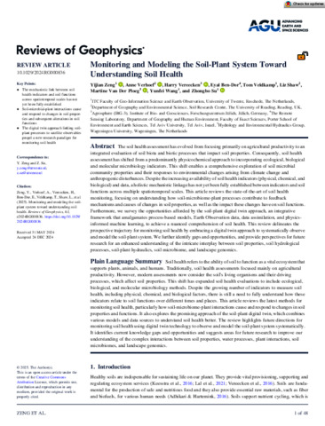 Zeng, Y., Verhoef, A. orcid id iconORCID: https://orcid.org/0000-0002-9498-6696, Vereecken, H., Ben-Dor, E., Veldkamp, T., Shaw, L., Van Der Ploeg, M., Wang, Y. and Su, Z. (2025) Monitoring and modeling the soil-plant system toward understanding soil health. Reviews of Geophysics, 63 (1). e2024RG000836. ISSN 8755-1209 doi: 10.1029/2024RG000836