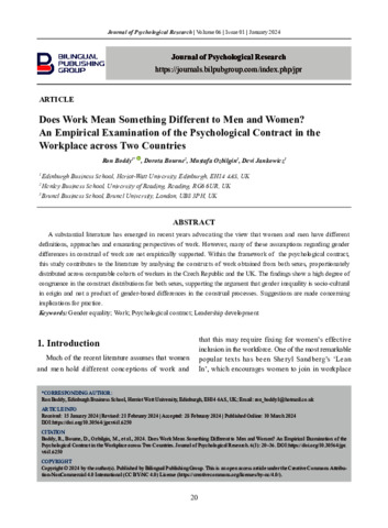 A substantial literature has emerged in recent years advocating the view that women and men have different definitions, approaches and emanating perspectives of work. However, many of these assumptions regarding gender differences in construal of work are not empirically supported. Within the framework of the psychological contract, this study contributes to the literature by analysing the constructs of work obtained from both sexes, proportionately distributed across comparable cohorts of workers in the Czech Republic and the UK. The findings show a high degree of congruence in the construct distributions for both sexes, supporting the argument that gender inequality is socio-cultural in origin and not a product of gender-based differences in the construal processes. Suggestions are made concerning implications for practice.