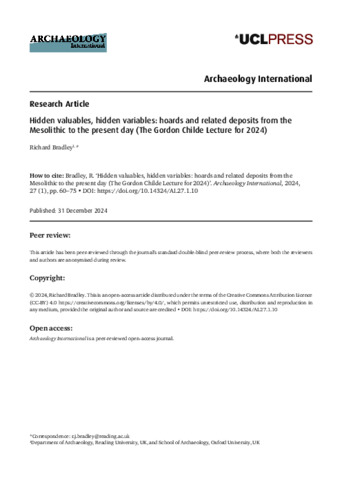 Bradley, R. (2025) Hidden valuables, hidden variables: hoards and related deposits from the Mesolithic to the present day (The Gordon Childe Lecture for 2024). Archaeology International, 27 (1). pp. 60-75. ISSN 2048-4194 doi: 10.14324/ai.27.1.10