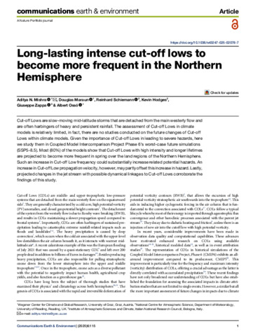 Mishra, A. N., Maraun, D., Schiemann, R. orcid id iconORCID: https://orcid.org/0000-0003-3095-9856, Hodges, K. orcid id iconORCID: https://orcid.org/0000-0003-0894-229X, Zappa, G. and Ossó, A. (2025) Long-lasting intense cut-off lows to become more frequent in the Northern Hemisphere. Communications Earth & Environment, 6. 115. ISSN 2662-4435 doi: 10.1038/s43247-025-02078-7