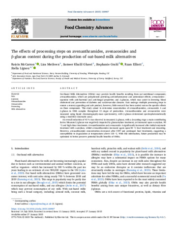McCarron, R., Methven, L., Khalil Ghawi, S., Grahl, S., Elliott, R. and Lignou, S. orcid id iconORCID: https://orcid.org/0000-0001-6971-2258 (2025) The effects of processing steps on avenanthramides, avenacosides and β-glucan content during the production of oat-based milk alternatives. Food Chemistry Advances, 6. 100907. ISSN 2772-753X doi: 10.1016/j.focha.2025.100907