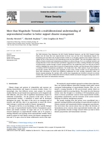Heinrich, D., Stephens, E. orcid id iconORCID: https://orcid.org/0000-0002-5439-7563 and Coughlan de Perez, E. (2024) More than Magnitude: towards a multidimensional understanding of unprecedented weather to better support disaster management. Water Security, 23. 100181. ISSN 2468-3124 doi: 10.1016/j.wasec.2024.100181