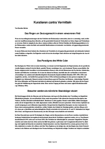 Der Vortrag geht der Relation zwischen dem Kuratieren und dem Vermitteln nach, das häufig als Konkurrenzverhältnis wahrgenommen wird. Anhand der folgenden fünf Parameter macht Dorothee Richter eine Bestandsaufnahme gegenwärtiger Beziehungen und Verflechtungen: dem Paradigma des White Cubes, der Besucher*innen als Staatsbürger*innen, der Institutionen als politische und ökonomische Apparate, der Kurator*innen als Meta-Künstler*innen und postfordistische Wunschfiguren und der Vermittlung als Versuch, das Subjekt aus seiner/ihrer festgelegten Position zu befreien.