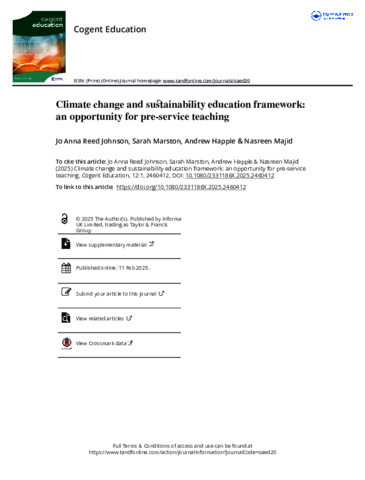 The National Climate Education Action Plan (NCEAP) included 9-actions. Action 2: develop an initial teacher (pre-service) education framework for embedding climate change and sustainability education responding to needing a climate action pedagogy to address the requirements of UK National Policy and Department for Education policy paper ‘Sustainability and climate change: a strategy for the education and children’s services systems’ (Department for Education, 2022). This paper presents a research project for implementing a framework across three age phases: early years, primary and secondary (2022–23). It explores the development and alignment of teaching to incorporate understanding of climate and su-stainability education enabling climate action. A qualitative approach was employed, drawing on surveys, reflective statements and interviews. Using thematic analysis the reflective statements from 10-teacher educators and a student focus group were analysed along with a student end point survey responses from 79 pre-service teachers. Exploring the extent to which the framework had facilitated the development of pre-service teachers’ understanding about how to teach climate change and sustainability education. The findings suggest that, whilst the sample size was small, there was the potential to embed climate change and sustainability education using a flexible framework, underpinned by thinking related to competencies across different initial teacher education programmes. Further research is needed to explore how this framework is applied and contextualised, and the impact it has in developing self-efficacy and competencies. An exploration of early adopters as part of a Delphi study or survey might help to contribute to this important area of research.