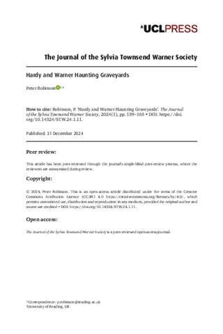 Robinson, P. orcid id iconORCID: https://orcid.org/0000-0002-7903-5438 (2024) Hardy and Warner haunting graveyards. The Journal of the Sylvia Townsend Warner Society, 24 (1). pp. 139-165. ISSN 2398-0605 doi: 10.14324/STW.24.1.11