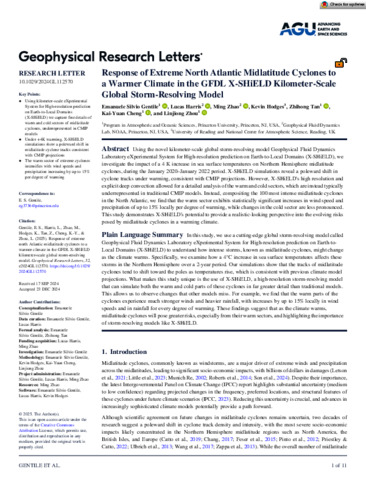 Response of extreme North Atlantic midlatitude cyclones to a warmer climate in the GFDL X‐SHiELD kilometer‐scale global storm‐resolving model.