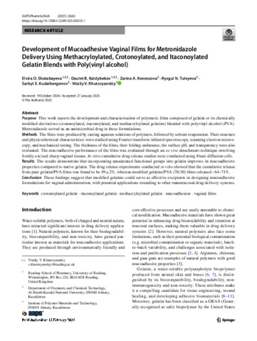 Development of mucoadhesive vaginal films for metronidazole delivery Using methacryloylated, crotonoylated, and itaconoylated gelatin blends with poly(vinyl alcohol).