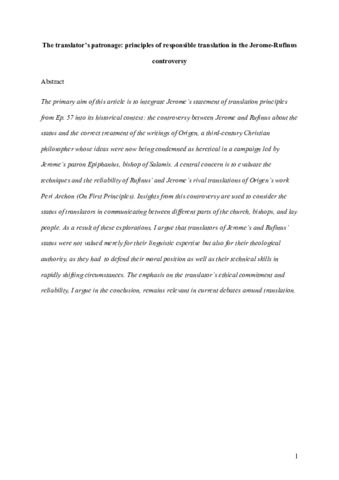 The primary aim of this article is to integrate Jerome’s statement of translation principles from Ep. 57 into its historical context: the controversy between Jerome and Rufinus about the status and the correct treatment of the writings of Origen, a third-century Christian philosopher whose ideas were now being condemned as heretical in a campaign led by Jerome’s patron Epiphanius, bishop of Salamis. A central concern is to evaluate the techniques and the reliability of Rufinus’ and Jerome’s rival translations of Origen’s work Peri Archon (On First Principles). Insights from this controversy are used to consider the status of translators in communicating between different parts of the church, bishops, and lay people. As a result of these explorations, I argue that translators of Jerome’s and Rufinus’ status were not valued merely for their linguistic expertise but also for their theological authority, as they had to defend their moral position as well as their technical skills in rapidly shifting circumstances. The emphasis on the translator’s ethical commitment and reliability, I argue in the conclusion, remains relevant in current debates around translation.