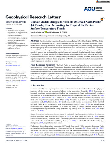 Climate models struggle to simulate observed North Pacific jet trends, even accounting for tropical Pacific sea surface temperature trends.