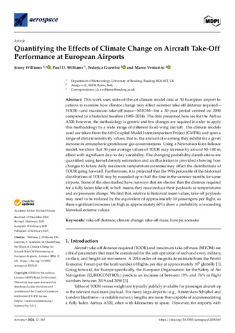 settingsOrder Article Reprints Open AccessArticle Quantifying the Effects of Climate Change on Aircraft Take-Off Performance at European Airports by Jonny Williams 1,*ORCID,Paul D. Williams 1ORCID,Federica Guerrini 2ORCID andMarco Venturini 2ORCID 1 Department of Meteorology, University of Reading, Reading RG6 6ET, UK 2 Amigo s.r.l., 00196 Rome, Italy * Author to whom correspondence should be addressed. Aerospace 2025, 12(3), 165; https://doi.org/10.3390/aerospace12030165 Submission received: 19 December 2024 / Revised: 24 January 2025 / Accepted: 18 February 2025 / Published: 20 February 2025 (This article belongs to the Section Air Traffic and Transportation) Downloadkeyboard_arrow_down Browse Figures Review Reports Versions Notes Abstract This work uses state-of-the-art climate model data at 30 European airport locations to examine how climate change may affect summer take-off distance required—TODR—and maximum take-off mass—MTOM—for a 30-year period centred on 2050 compared to a historical baseline (1985–2014). The data presented here are for the Airbus A320; however, the methodology is generic and few changes are required in order to apply this methodology to a wide range of different fixed-wing aircraft. The climate models used are taken from the 6th Coupled Model Intercomparison Project (CMIP6) and span a range of climate sensitivity values; that is, the amount of warming they exhibit for a given increase in atmospheric greenhouse gas concentrations. Using a Newtonian force-balance model, we show that 30-year average values of TODR may increase by around 50–100 m, albeit with significant day-to-day variability. The changing probability distributions are quantified using kernel density estimation and an illustration is provided showing how changes to future daily maximum temperature extremes may affect the distributions of TODR going forward. Furthermore, it is projected that the 99th percentile of the historical distributions of TODR may by exceeded up to half the time in the summer months for some airports. Some of the sites studied have runways that are shorter than the distance required for a fully laden take-off, which means they must reduce their payloads as temperatures and air pressures change. We find that, relative to historical mean values, take-off payloads may need to be reduced by the equivalent of approximately 10 passengers per flight, as these significant increases (as high as approximately 60%) show a probability of exceeding historical extreme values.