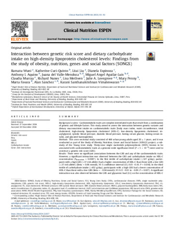 Wuni, R., Curi-Quinto, K., Liu, L., Espinoza, D., Aquino, A. I., del Valle-Mendoza, J., Aguilar-Luis, M. A., Murray, C., Nunes, R. orcid id iconORCID: https://orcid.org/0000-0003-0829-4130, Methven, L., Lovegrove, J. A. orcid id iconORCID: https://orcid.org/0000-0001-7633-9455, Penny, M., Favara, M., Sánchez, A. and Santhanakrishnan Vimaleswaran, K. orcid id iconORCID: https://orcid.org/0000-0002-8485-8930 (2025) Interaction between genetic risk score and dietary carbohydrate intake on high-density lipoprotein cholesterol levels: findings from the study of obesity, nutrition, genes and social factors (SONGS). Clinical Nutrition ESPEN, 66. pp. 83-92. ISSN 2405-4577 doi: 10.1016/j.clnesp.2024.12.027