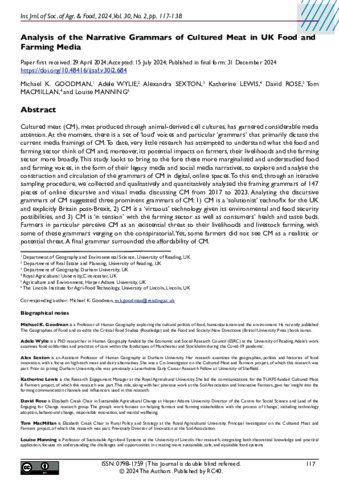 Cultured meat (CM), meat produced through animal-derived cell cultures, has garnered considerable media attention. At the moment, there is a set of ‘loud’ voices and particular ‘grammars’ that primarily dictate the current media framings of CM. To date, very little research has attempted to understand what the food and farming sector think of CM and, moreover, its potential impacts on farmers, their livelihoods and the farming sector more broadly. This study looks to bring to the fore these more marginalised and understudied food and farming voices, in the form of their legacy media and social media narratives, to explore and analyse the construction and circulation of the grammars of CM in digital, online spaces. To this end, through an iterative sampling procedure, we collected and qualitatively and quantitatively analysed the framing grammars of 147 pieces of online discursive and visual media discussing CM from 2017 to 2023. Analysing the discursive grammars of CM suggested three prominent grammars of CM: 1) CM is a ‘solutionist’ technofix for the UK and explicitly Britain post-Brexit, 2) CM is a ‘virtuous’ technology given its environmental and food security possibilities, and 3) CM is ‘in tension’ with the farming sector as well as consumers’ health and taste buds. Farmers in particular perceive CM as an existential threat to their livelihoods and livestock farming, with some of these grammars verging on the conspiratorial. Yet, some farmers did not see CM as a realistic or potential threat. A final grammar surrounded the affordability of CM.