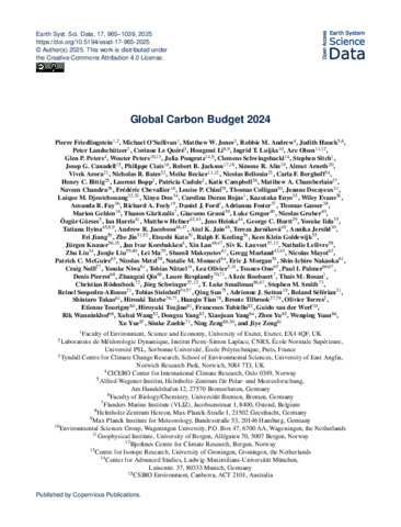 Friedlingstein, P., O'Sullivan, M., Jones, M. W., Andrew, R. M., Hauck, J., Landschützer, P., Le Quéré, C., Li, H., Luijkx, I. T., Olsen, A., Peters, G. P., Peters, W., Pongratz, J., Schwingshackl, C., Sitch, S., Canadell, J. P., Ciais, P., Jackson, R. B., Alin, S. R., Arneth, A., Arora, V., Bates, N. R., Becker, M., Bellouin, N. orcid id iconORCID: https://orcid.org/0000-0003-2109-9559, Berghoff, C. F., Bittig, H. C., Bopp, L., Cadule, P., Campbell, K., Chamberlain, M. A., Chandra, N., Chevallier, F., Chini, L. P., Colligan, T., Decayeux, J., Djeutchouang, L. M., Dou, X., Duran Rojas, C., Enyo, K., Evans, W., Fay, A. R., Feely, R. A., Ford, D. J., Foster, A., Gasser, T., Gehlen, M., Gkritzalis, T., Grassi, G., Gregor, L., Gruber, N., Gürses, Ö., Harris, I., Hefner, M., Heinke, J., Hurtt, G. C., Iida, Y., Ilyina, T., Jacobson, A. R., Jain, A. K., Jarníková, T., Jersild, A., Jiang, F., Jin, Z., Kato, E., Keeling, R. F., Goldewijk, K. K., Knauer, J., Korsbakken, J. I., Lan, X., Lauvset, S. K., Lefèvre, N., Liu, Z., Liu, J., Ma, L., Maksyutov, S., Marland, G., Mayot, N., McGuire, P. orcid id iconORCID: https://orcid.org/0000-0001-6592-4966, Metzl, N., Monacci, N. M., Morgan, E. J., Nakaoka, S.-I., Neill, C., Niwa, Y., Nützel, T., Olivier, L., Ono, T., Palmer, P. I., Pierrot, D., Qin, Z., Resplandy, L., Roobaert, A., Rosan, T. M., Rödenbeck, C., Schwinger, J., Smallman, T. L., Smith, S. M., Sospedra-Alfonso, R., Steinhoff, T., Sun, Q., Sutton, A. J., Séférian, R., Takao, S., Tatebe, H., Tian, H., Tilbrook, B., Torres, O., Tourigny, E., Tsujino, H., Tubiello, F., van der Wer, G., Wanninkhof, R., Wang, X., Yang, D., Yang, X., Yu, Z., Yuan, W., Yue, X., Zaehle, S., Zeng, N. and Zeng, J. (2025) Global carbon budget 2024. Earth System Science Data, 17 (3). pp. 965-1039. ISSN 1866-3516 doi: 10.5194/essd-17-965-2025