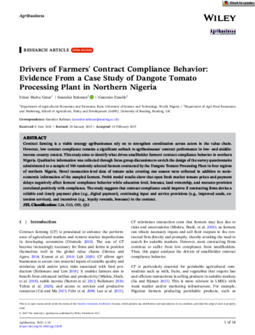 Contract farming is a viable strategy agribusinesses rely on to strengthen coordination across actors in the value chain. However, low contract compliance remains a significant setback to agribusinesses' contract performance in low‐ and middle‐income country context. This study aims to identify what drives smallholder farmers' contract compliance behavior in northern Nigeria. Qualitative information was collected through focus group discussions to enrich the design of the survey questionnaire administered to a sample of 300 randomly selected farmers contracted by the Dangote Tomato Processing Plant in four regions of northern Nigeria. Novel transaction‐level data of tomato sales covering one season were collected in addition to socioeconomic information of the sampled farmers. Probit model results show that open fresh market tomato prices and payment delays negatively affect farmers' compliance behavior while education level, bonuses, land ownership, and resource‐provision correlated positively with compliance. The study suggests that contract compliance could improve if contracting firms devise a reliable and timely payment plan (e.g., digital payment), continuing input and service provisions (e.g., improved seeds, ex�tension services), and incentives (e.g., loyalty rewards, bonuses) in the contract