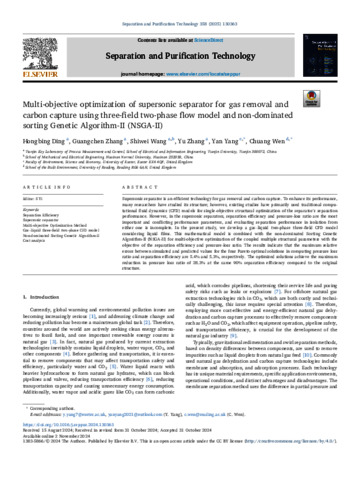 Multi-objective optimization of supersonic separator for gas removal and carbon capture using three-field two-phase flow model and non-dominated sorting Genetic Algorithm-II (NSGA-II).