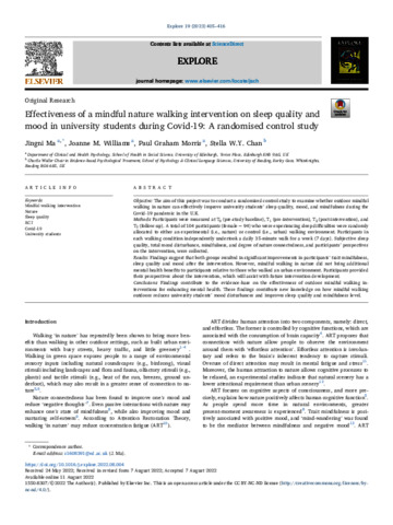 Ma, J. orcid id iconORCID: https://orcid.org/0000-0002-7670-8641, Williams, J. M., Morris, P. G. and Chan, S. W. Y. orcid id iconORCID: https://orcid.org/0000-0003-4088-4528 (2023) Effectiveness of a mindful nature walking intervention on sleep quality and mood in university students during Covid-19: a randomised control study. EXPLORE, 19 (3). pp. 405-416. ISSN 1878-7541 doi: 10.1016/j.explore.2022.08.004