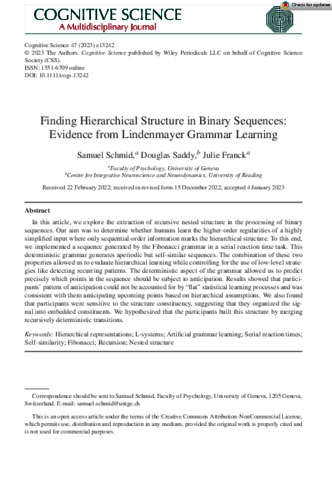 Schmid, S., Saddy, D. and Franck, J. (2023) Finding hierarchical structure in binary sequences: evidence from Lindenmayer grammar learning. Cognitive science, 47 (1). e13242. ISSN 1551-6709 doi: 10.1111/cogs.13242