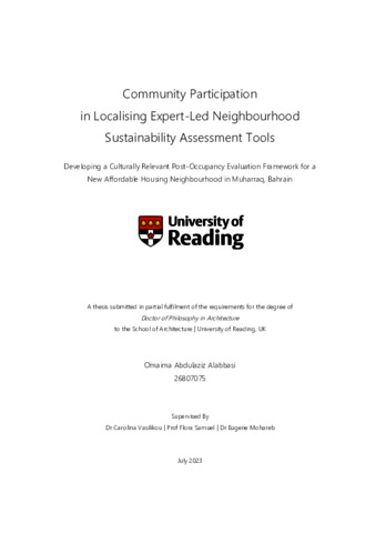 Alabbasi, O. A. (2024) Community participation in localising expert-led neighbourhood sustainability assessment tools: developing a culturally relevant post-occupancy evaluation framework for a new affordable housing neighbourhood in Muharraq, Bahrain. PhD thesis, University of Reading. doi: 10.48683/1926.00121905