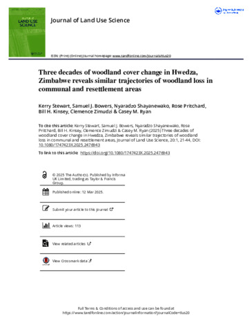 Stewart, K., Bowers, S. J., Shayanewako, N., Pritchard, R., Kinsey, B. H., Zimudzi, C. and Ryan, C. M. (2025) Three decades of woodland cover change in Hwedza, Zimbabwe reveals similar trajectories of woodland loss in communal and resettlement areas. Journal of Land Use Science, 20 (1). pp. 21-44. ISSN 1747-423X doi: 10.1080/1747423X.2025.2476943