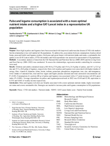 Kaimila, Y. orcid id iconORCID: https://orcid.org/0000-0002-1650-9050, Olotu, O. A., Clegg, M. E., Jackson, K. G. orcid id iconORCID: https://orcid.org/0000-0002-0070-3203 and Lovegrove, J. A. orcid id iconORCID: https://orcid.org/0000-0001-7633-9455 (2025) Pulse and legume consumption is associated with a more optimal nutrient intake and a higher EAT-Lancet index in a representative UK population. European Journal of Nutrition, 64. 139. ISSN 1436-6215 doi: 10.1007/s00394-025-03611-2