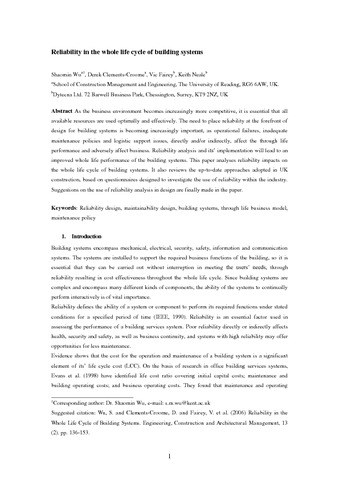Wu, S., Clements-Croome, D. J., Fairey, V., Neale, K., Albany, B., Sidhu, J. and Desmond, D. (2006) Reliability in the whole life cycle of building systems. Engineering, Construction and Architectural Management, 13 (2). pp. 136-153. ISSN 0969-9988 doi: 10.1108/09699980610659607