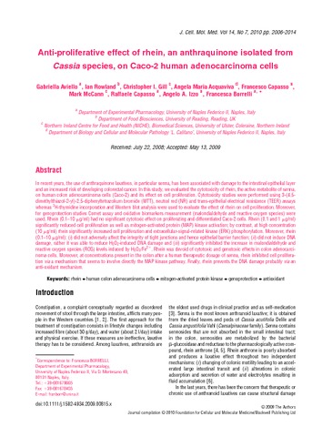 Aviello, G., Rowland, I., Gill, C.I., Acquaviva, A.M., Capasso, F., McCann, M., Capasso, R., Izzo, A.A. and Borrelli, F. (2010) Anti-proliferative effect of rhein, an anthraquinone isolated from Cassia species, on Caco-2 human adenocarcinoma cells. Journal of Cellular and Molecular Medicine, 14 (7). pp. 2006-2014. ISSN 1582-4934 doi: 10.1111/j.1582-4934.2009.00815.x