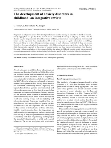 Murray, L., Creswell, C. and Cooper, P. J. (2009) The development of anxiety disorders in childhood: an integrative review. Psychological Medicine, 39 (9). pp. 1413-1423. ISSN 1469-8978 doi: 10.1017/s0033291709005157
