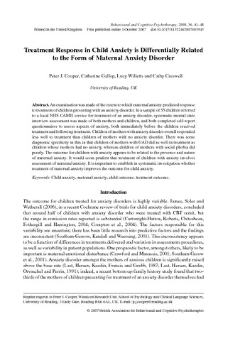 Cooper, P. J., Gallop, C., Willetts, L. and Creswell, C. (2008) Treatment response in child anxiety is differentially related to the form of maternal anxiety disorder. Behavioural and Cognitive Psychotherapy, 36 (1). pp. 41-48. ISSN 1352-4658 doi: 10.1017/s1352465807003943
