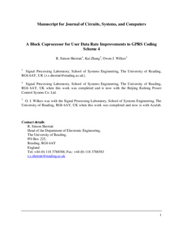 Publisher Statement Electronic version of an article published as: Sherratt, R.S., Zhang, K. and Wilkes, O.J. (2007) A block coprocessor for user data rate improvements to GPRS coding scheme 4. Journal of Circuits Systems and Computers, 16 (4). pp. 541-551. ISSN 0218-126 [DOI:101142/S0218126607003848] © World Scientific Publishing Company [Journal URL http://www.worldscinet.com/jcsc/]