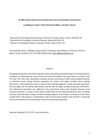 Billington, J., Field, D. T. orcid id iconORCID: https://orcid.org/0000-0003-4041-8404, Wilkie, R. M. and Wann, J. P. (2010) An fMRI study of parietal cortex involvement in the visual guidance of locomotion. Journal of Experimental Psychology. Human Perception and Performance, 36 (6). pp. 1495-1507. ISSN 0096-1523 doi: 10.1037/a0018728