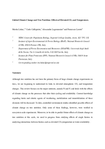 Although tree nutrition has not been the primary focus of large climate change experiments on trees, we are beginning to understand its links to elevated atmospheric CO2 and temperature changes. This review focuses on the major nutrients, namely N and P, and deals with the effects of climate change on the processes that alter their cycling and availability. Current knowledge regarding biotic and abiotic agents of weathering, mobilization and immobilization of these elements will be discussed. To date, controlled environment studies have identified possible effects of climate change on tree nutrition. Only some of these findings, however, were verified in ecosystem scale experiments. Moreover, to be able to predict future effects of climate change on tree nutrition at this scale, we need to progress from studying effects of single factors to analysing interactions between factors such as elevated CO2, temperature or water availability.