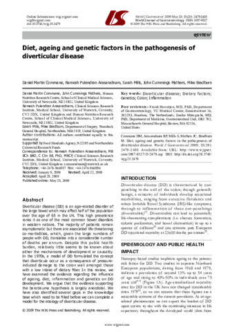 Commane, D. M., Arasaradnam, R. P., Mills, S., Mathers, J. C. and Bradburn, M. (2009) Diet, ageing and genetic factors in the pathogenesis of diverticular disease. World Journal of Gastroenterology, 15 (20). pp. 2479-2488. ISSN 1007-9327 doi: 10.3748/wjg.15.2479