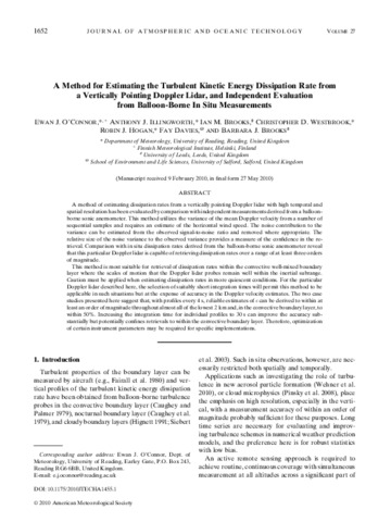 O'Connor, E. J., Illingworth, A. J. orcid id iconORCID: https://orcid.org/0000-0002-5774-8410, Brooks, I. M., Westbrook, C. D. orcid id iconORCID: https://orcid.org/0000-0002-2889-8815, Hogan, R. J. orcid id iconORCID: https://orcid.org/0000-0002-3180-5157, Davies, F. and Brooks, B. J. (2010) A method for estimating the turbulent kinetic energy dissipation rate from a vertically pointing Doppler lidar, and independent evaluation from balloon-borne in situ measurements. Journal of Atmospheric and Oceanic Technology, 27 (10). pp. 1652-1664. ISSN 1520-0426 doi: 10.1175/2010JTECHA1455.1