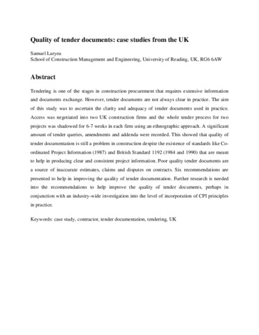 Laryea, S. (2011) Quality of tender documents: case studies from the UK. Construction Management and Economics, 29 (3). pp. 275-286. ISSN 0144-6193 doi: 10.1080/01446193.2010.540019