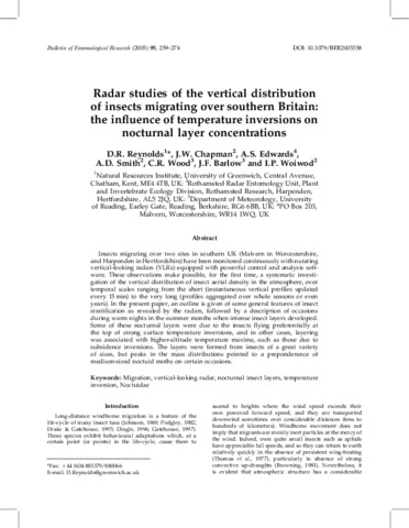 Reynolds, D.R., Chapman, J.W., Edwards, A.S., Smith, A.D., Wood, C. R., Barlow, J. F. and Woiwod, I.P. (2005) Radar studies of the vertical distribution of insects migrating over southern Britain: the influence of temperature inversions on nocturnal layer concentrations. Bulletin of Entomological Research, 95 (3). pp. 259-274. ISSN 0007-4853