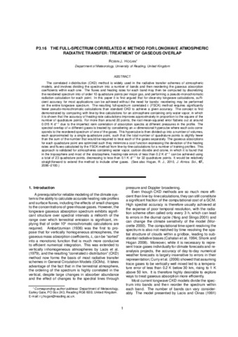 Hogan, R. J. orcid id iconORCID: https://orcid.org/0000-0002-3180-5157 (2010) The full-spectrum correlated k method for longwave atmospheric radiative transfer: treatment of gaseous overlap. In: American Meteorological Society 13th Conference on Atmospheric Radiation, 28 June - 2 July 2010, Portland, Oregon, USA. (Unpublished)