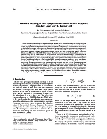 Atkinson, B. W., Li, J.-G. and Plant, R. S. orcid id iconORCID: https://orcid.org/0000-0001-8808-0022 (2001) Numerical modeling of the propagation environment in the atmospheric boundary layer over the Persian Gulf. Journal of Applied Meteorology and Climatology, 40 (3). pp. 586-603. ISSN 1520-0450 doi: 10.1175/1520-0450(2001)040<0586:NMOTPE>2.0.CO;2
