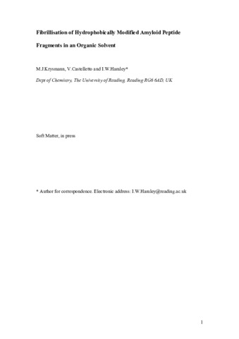 Krysmann, M.J., Castelletto, V. and Hamley, I. W. orcid id iconORCID: https://orcid.org/0000-0002-4549-0926 (2007) Fibrillisation of hydrophobically modified amyloid peptide fragments in an organic solvent. Soft Matter, 3 (11). pp. 1401-1406. ISSN 1744-683X doi: 10.1039/b709889h