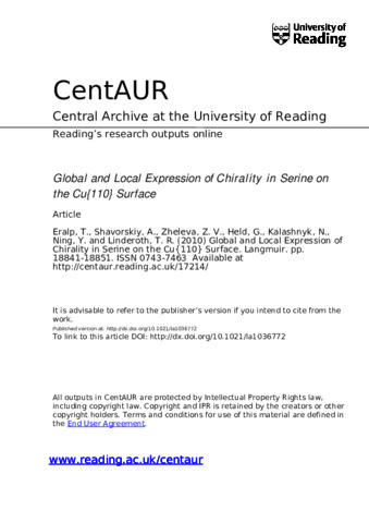 Eralp, T., Shavorskiy, A., Zheleva, Z. V., Held, G. F. K., Kalashnyk, N., Ning, Y. and Linderoth, T. R. (2010) Global and local expression of chirality in serine on the Cu{110} surface. Langmuir, 26 (24). pp. 18841-18851. ISSN 0743-7463 doi: 10.1021/la1036772